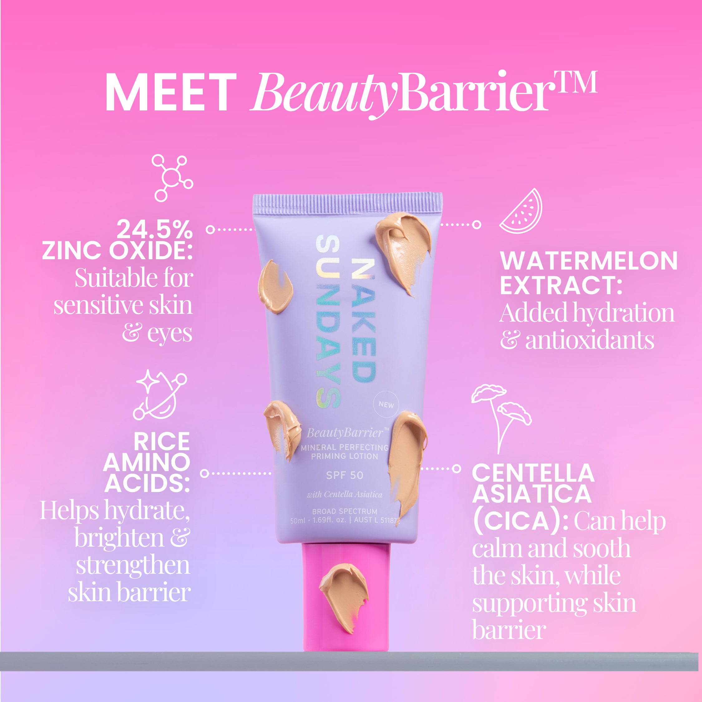 BeautyBarrier™ is a beauty-first mineral SPF50 that combines barrier soothing properties with a hydrating mineral SPF priming base in one effortless step.