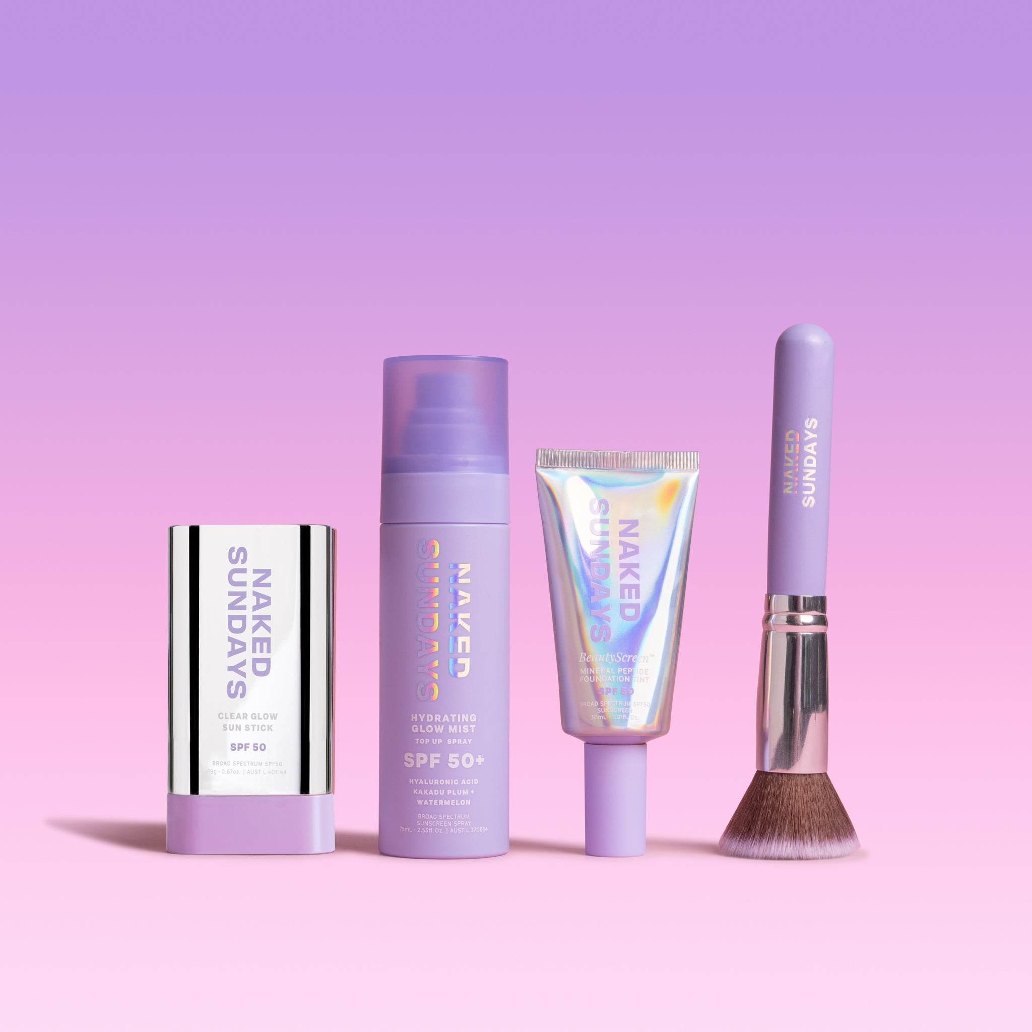 Naked Sundays bundle containing SPF50+ Glow Mist, SPF Clear Glow Sun Stick, BeautyScreen Peptide Tinted Foundation SPF50 and SPF BFF Brush