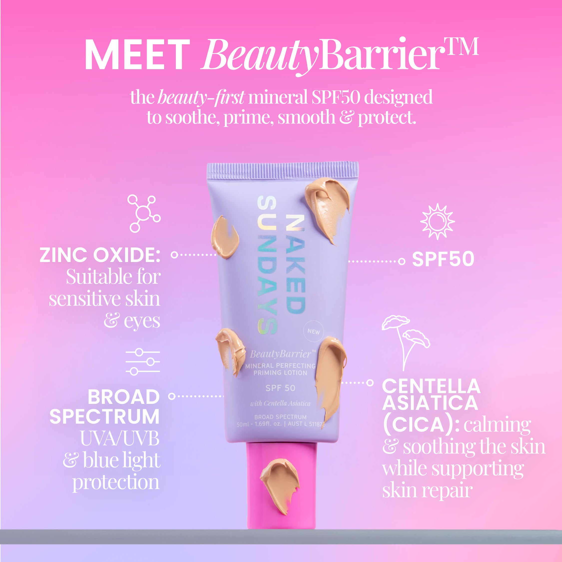 BeautyBarrier™ is a beauty-first mineral SPF50 that combines barrier soothing properties with a hydrating mineral SPF priming base in one effortless step.