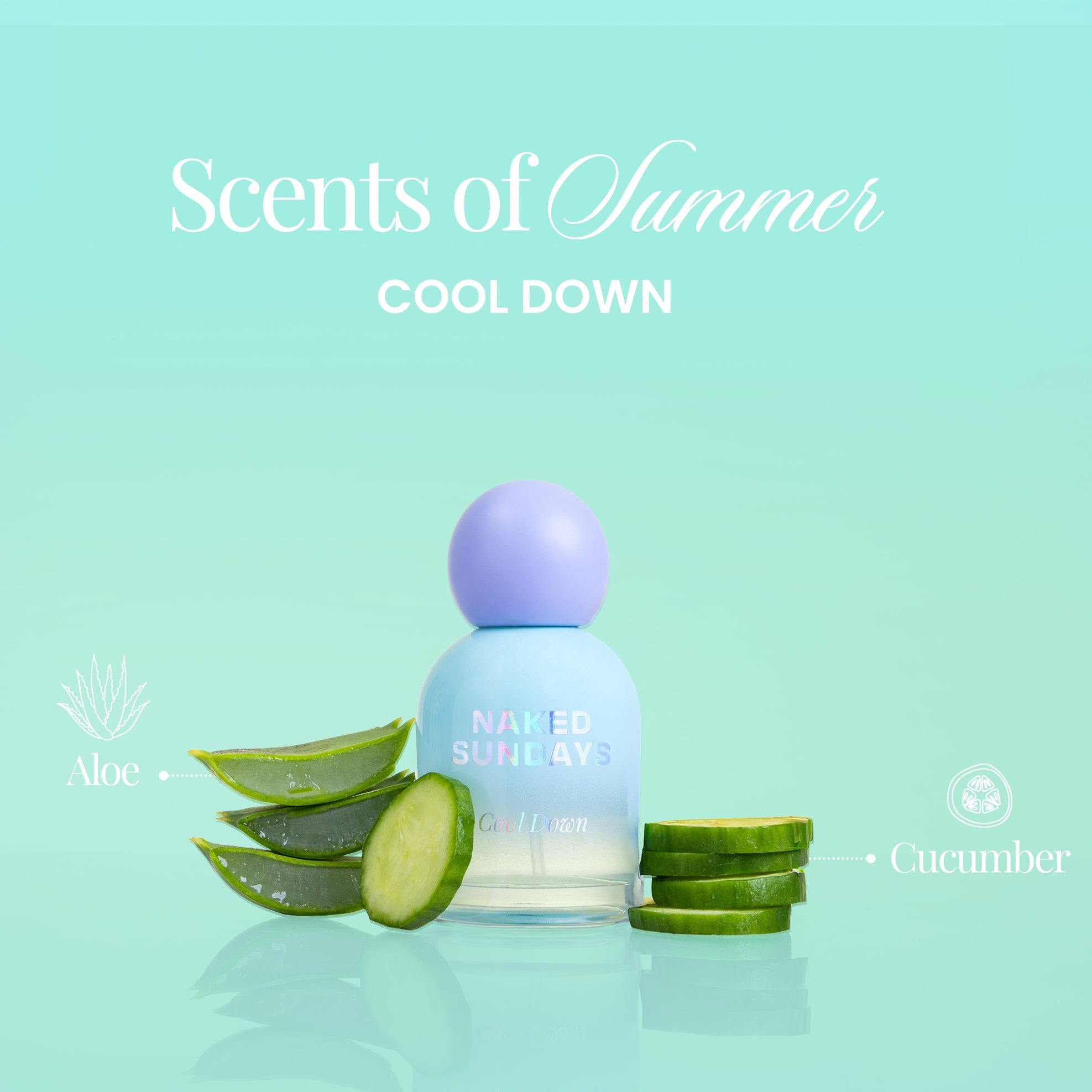 Like slipping into cool sheets after a Summer swim. Cool Down is your bare-skin scent, fresh cucumber and green leaves meet soft citrus for a crisp, cooling opening. A heart of delicate florals and dewy aloe brings that fresh-out-of-the-ocean energy, finished with warm, skin-like musk that lingers softly.